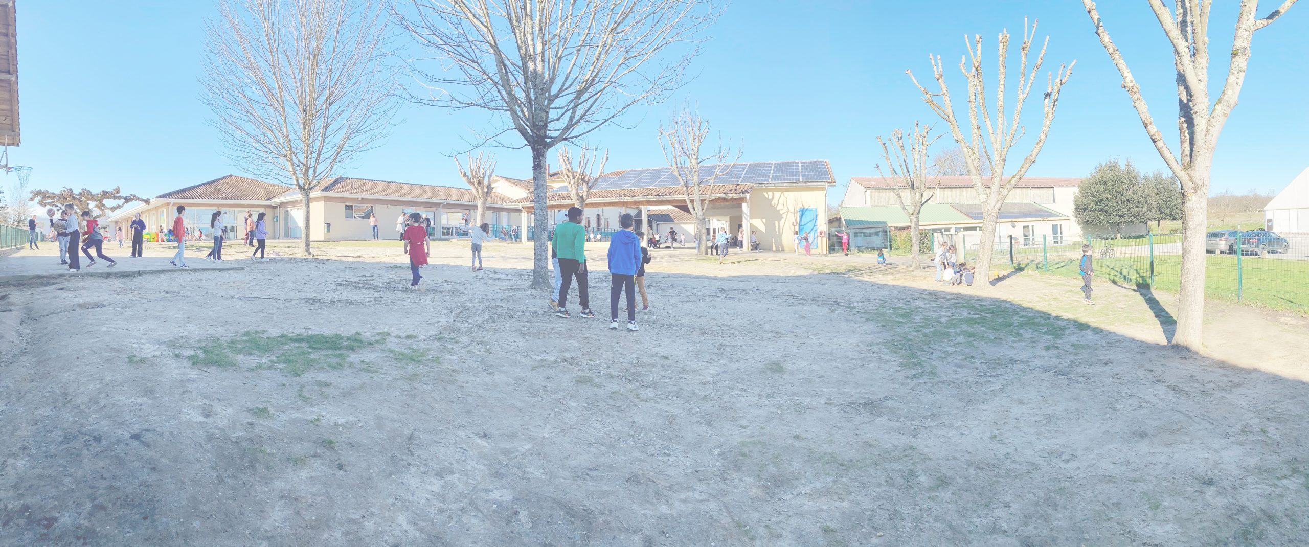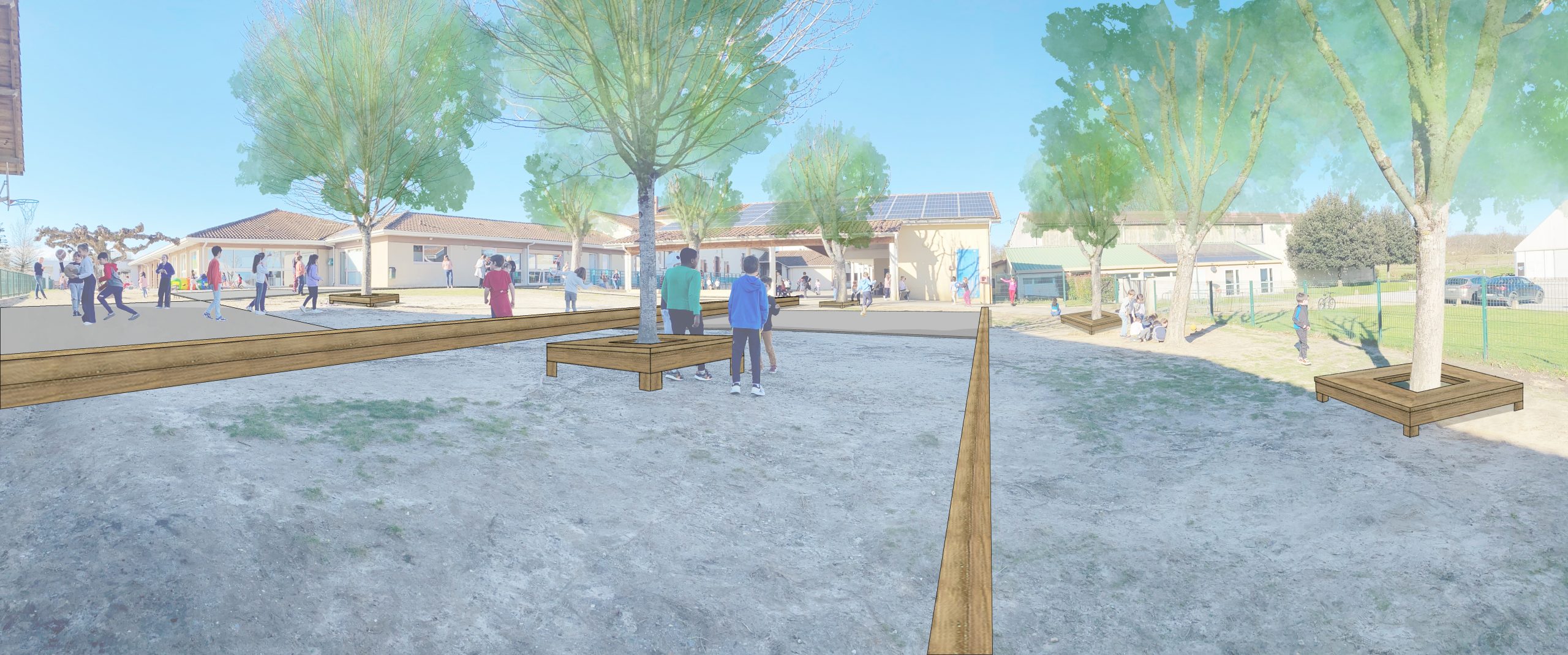 Benquet : Mise en situation des intentions de projet à la suite des ateliers participatifs avec les élèves et les enseignants. Préservation des arbres existants pour réduire les îlots de chaleur et créer de l’ombre pour les assises en bois, dalle en béton drainant pour les espaces sportifs, conservation et confortement des surfaces perméables pour les espaces intermédiaires (grave calcaire).