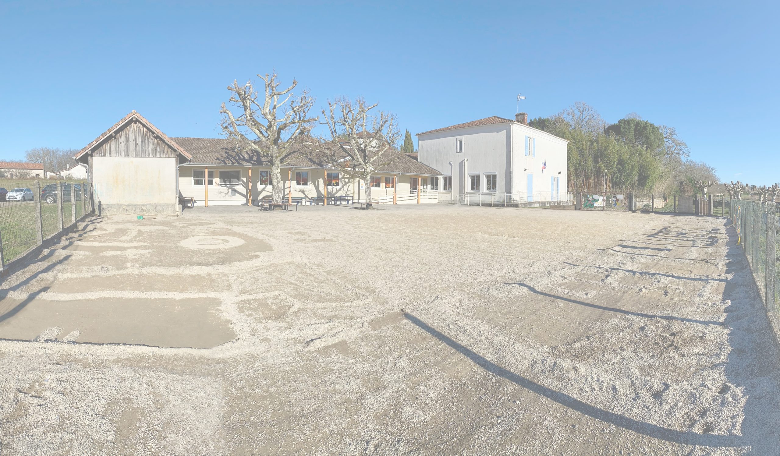 Benquet : Mise en situation des intentions de projet à la suite des ateliers participatifs avec les élèves et les enseignants. Préservation des arbres existants pour réduire les îlots de chaleur et créer de l’ombre pour les assises en bois, dalle en béton drainant pour les espaces sportifs, conservation et confortement des surfaces perméables pour les espaces intermédiaires (grave calcaire).