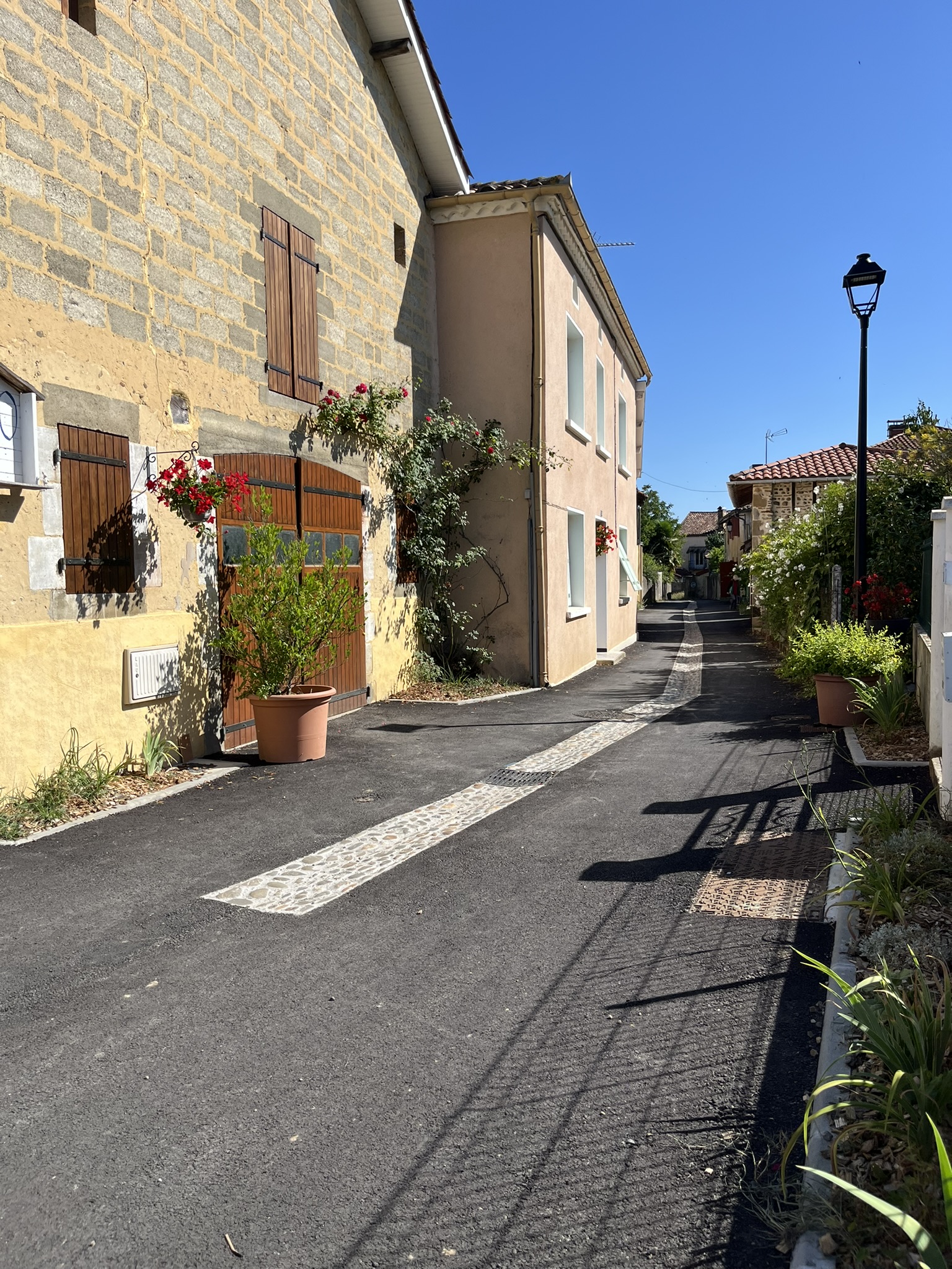 En pied de façades, espaces plantés, calades et seuils en béton désactivé s’alternent pour donner un nouveau visage aux rues étroites du bourg castral.